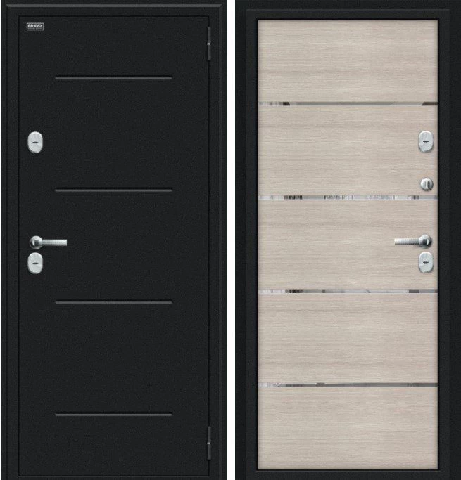 Надежная входная Дверь Браво Thermo Лайн Букле черное/Cappuccino Veralinga премиум класса по цене 43 350 руб. Большая толщина стали защитит от проникновения в ваш дом, квартиру или коттедж. Используется очень качественная фурнитура: замки, цилиндры, ручки, защелки. Покрытие и отделка двери изготовлено под внимательным контролем производителя. Дверь имеет долгий срок службы и гарантию.